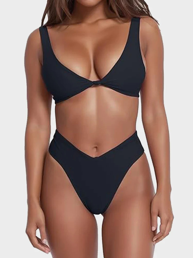 Bikini Set for Women Solid V Neck Knot Front Push Up High Leg Thong Two Piece Swimsuit