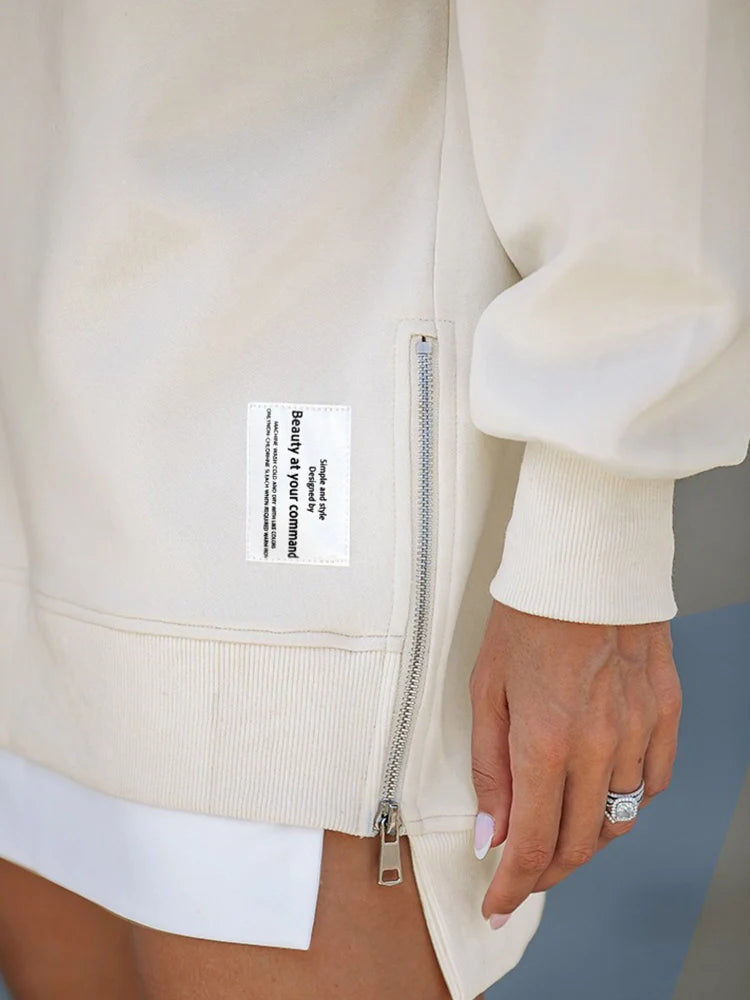 Effortlessly chic, this long sleeve drop shoulder pullover combines relaxed comfort with modern design. Featuring a casual side slit with zipper detail, it adds a subtle edge to any outfit while maintaining a clean, versatile silhouette.