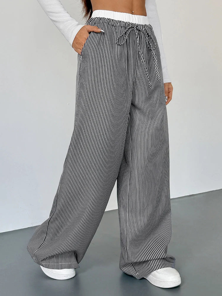 Women's Striped High Waist Wide Leg Pants Loose Color Block Straight Leg Suit Trousers